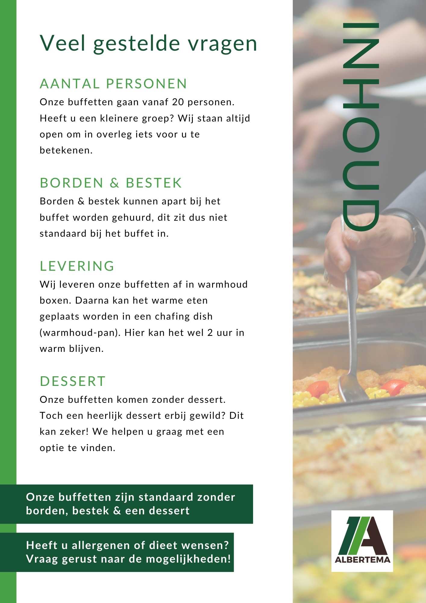 Onze buffetten worden standaard geleverd zonder borden, bestek en dessert. Borden en bestek kunnen apart bij het buffet worden gehuurd, zodat je hierin zelf de keuze houdt.